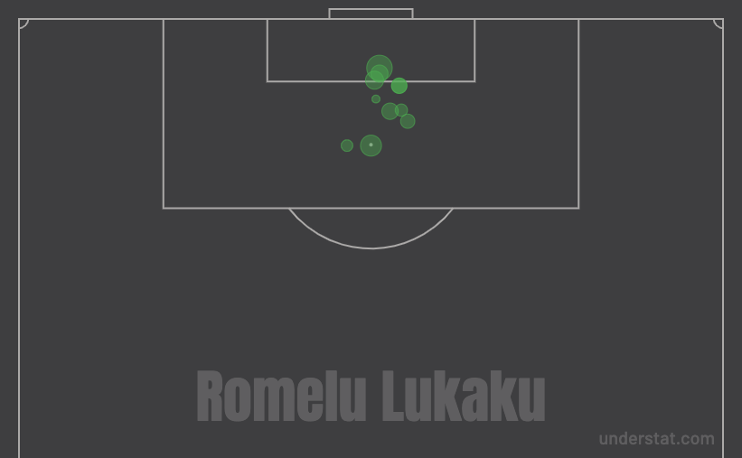 This “second six-yard box” has been a goldmine for Lukaku this season; per Understat, every single one of his open-play goals in the league has come from a central position between four and twelve yards from goal.