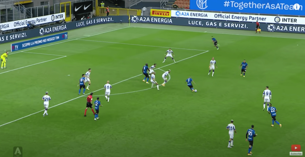 A one-touch pass by Lukaku finds Alexis Sanchez with time and space to pick a pass in behind the defence. By the time Sanchez plays the ball for Achraf Hakimi, Lukaku is already instinctively moving goalside of his marker.