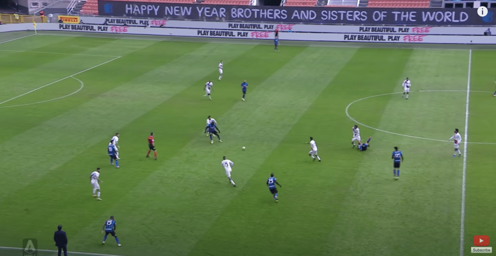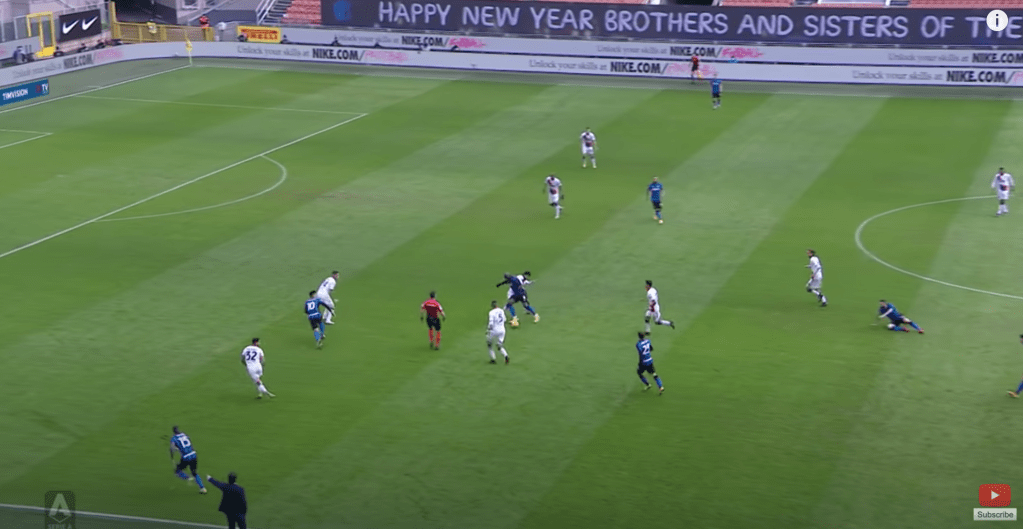 Here, Vidal has played a wide ball to Hakimi down the right. Lukaku races up the left channel, dragging Bologna’s left-sided center-back, Takehiro Tomiyasu, away from the ball.